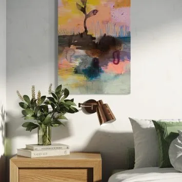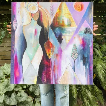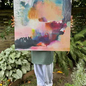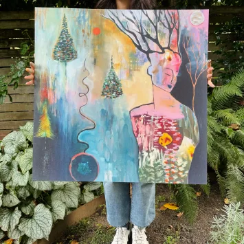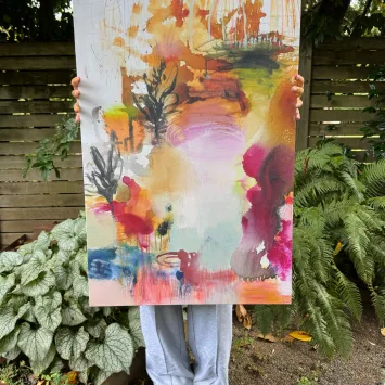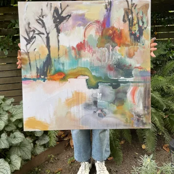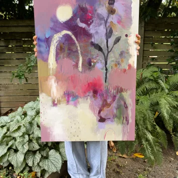 Price range: $96.00 through $195.00Get lost in the dreamy softness, bright pops of color, and loose brushstrokes of the magical place called HeartLand. This vivid, fade-resistant canvas print features Flora’s original acrylic painting “HeartLand” (2024). PLEASE NOTE: The canvas size shown on the walls and being held is 30″ x 30″.
