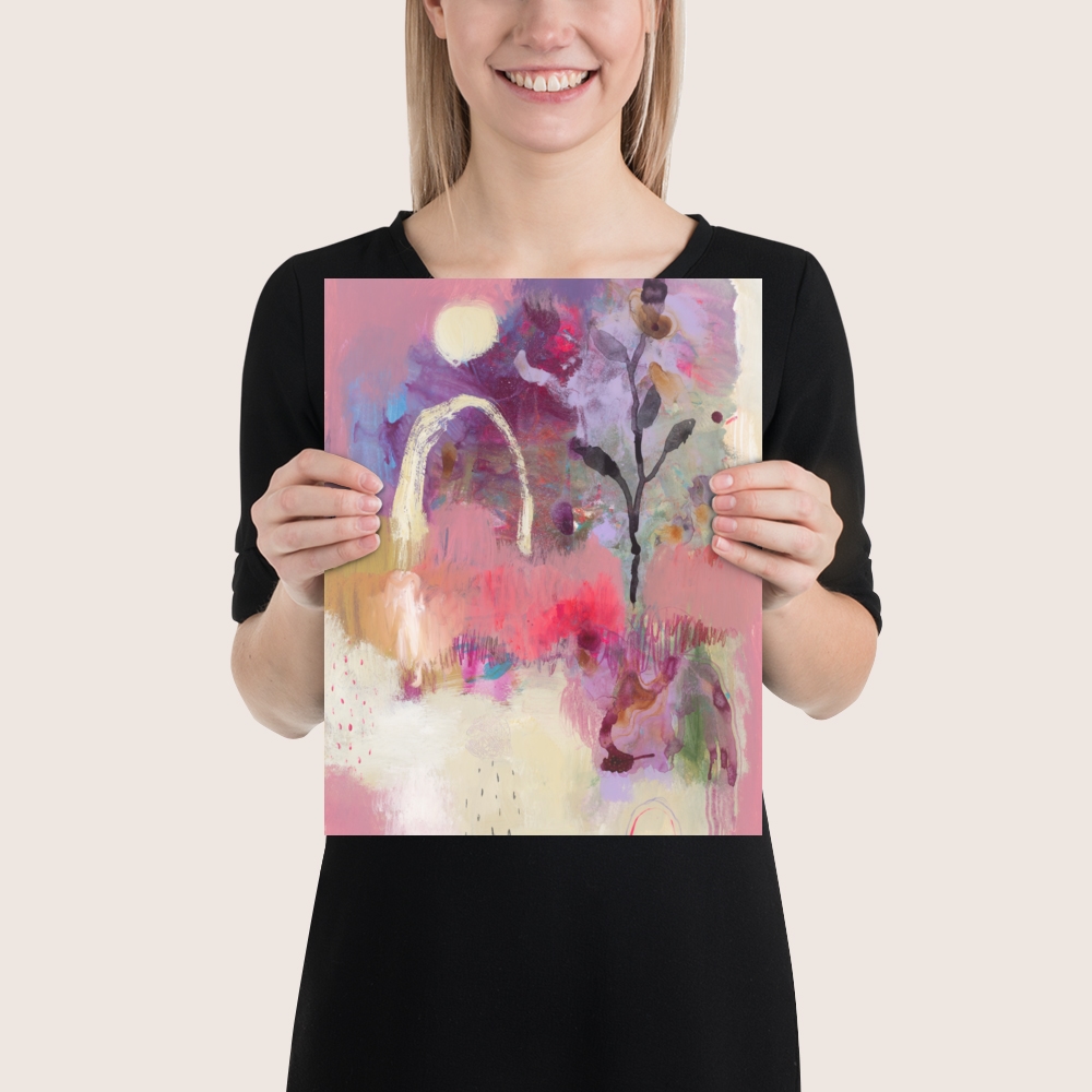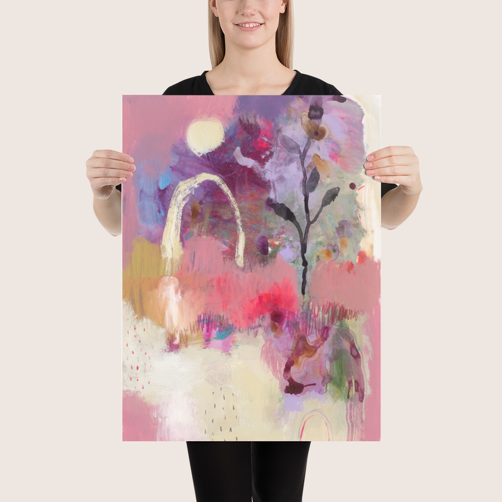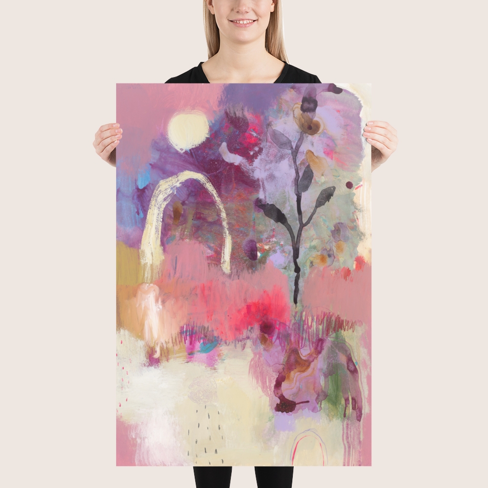 Hang the ever-present warmth of nature’s finest pinks and purples on display in your space with this museum-quality art print, made on thick matte paper sourced from Japan, of Flora’s original painting “Eastern Sun” (2024).
