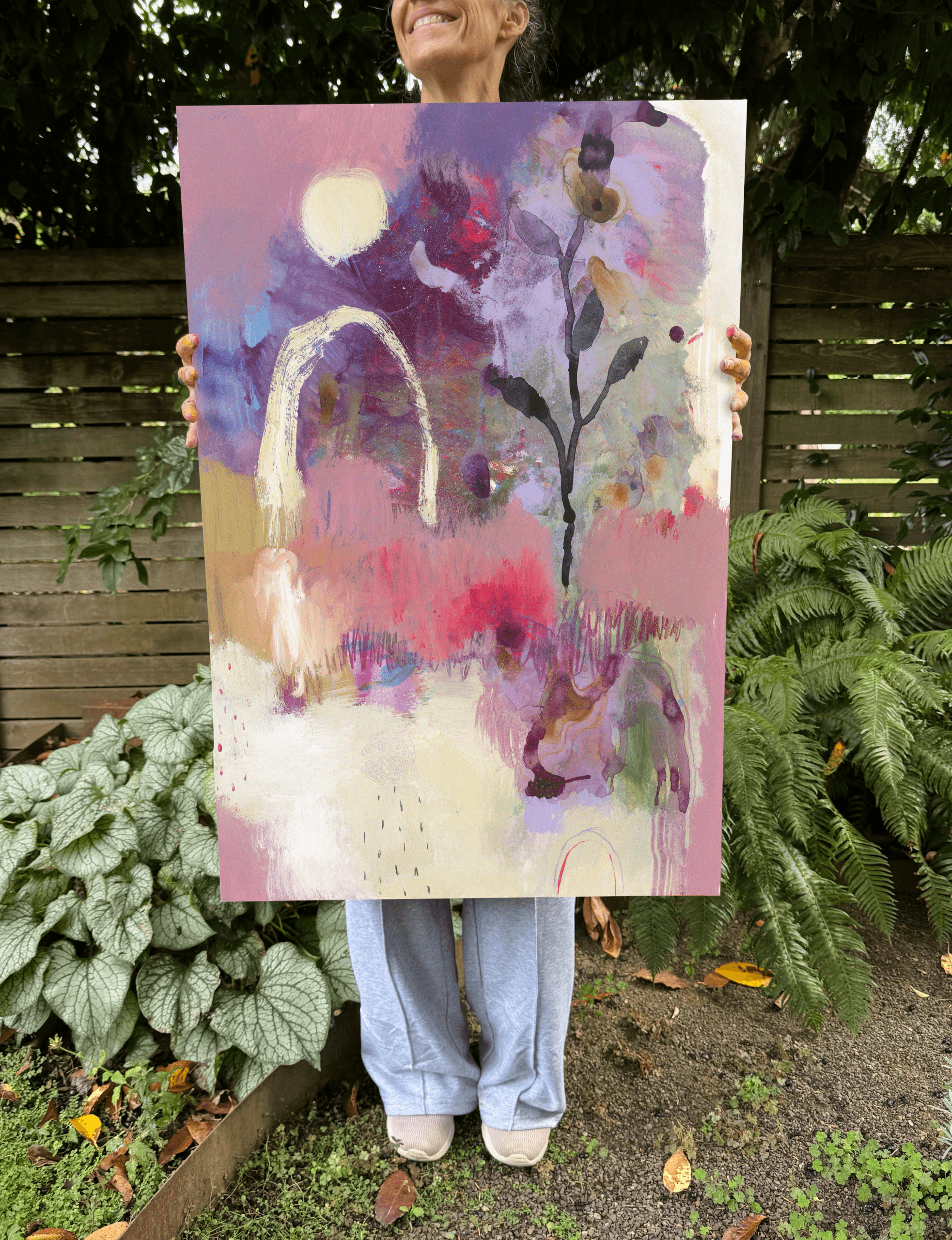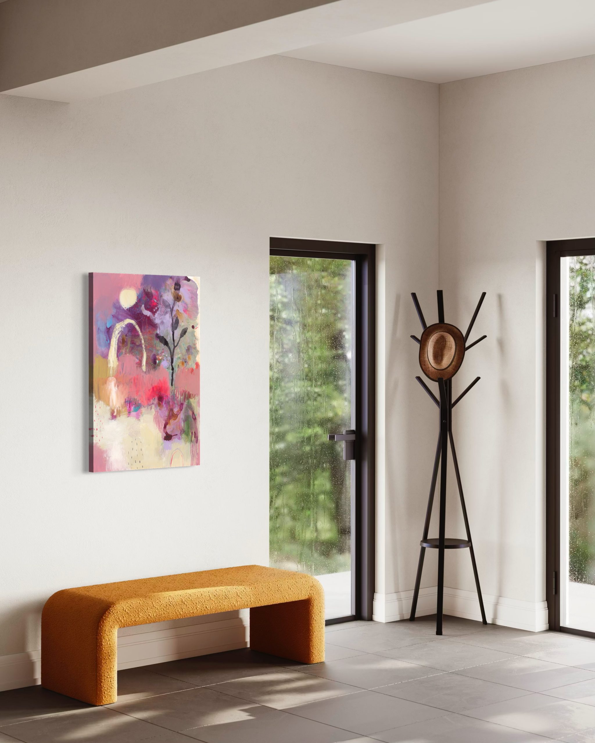 Bring the ever-present warmth of nature’s finest pinks and purples into your space with this vivid, fade-resistant canvas print of Flora’s original painting “Eastern Sun” (2024).